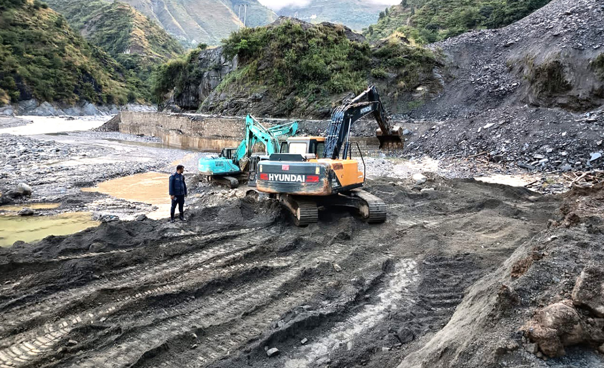 विपी राजमार्गअन्तर्गत काभ्रेपलाञ्चोकको रोशी गाउँपालिकास्थित चारसय बेसीमा रोशी खोलाको बाढीले सडक बगाएपछि डाइभर्सन निर्माण गरिँदै । तस्वीर : रासस