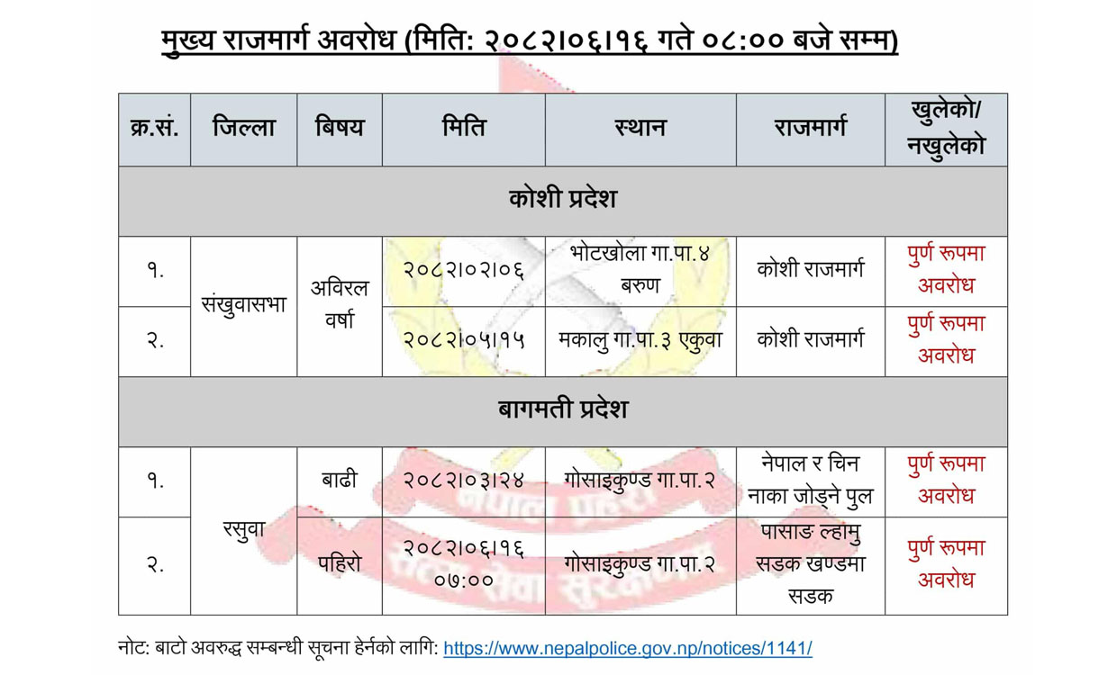 कोशी र बागमती प्रदेशका मुख्य राजमार्ग चार ठाउँमा अवरुद्ध
